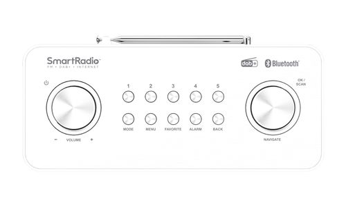 Wifi-Smart Radio | DAB+ / FM-RDS Receiver | Internet radio via WiFi | Bluetooth Audio-Streaming (A2DP) | Spotify Connect | USB and Line-In (3.5 mm) | Clock with Dual-Alarm and Sleeptimer | Remote Control via UNDOK App | IR-Remote Control (2 x AAA/LR03 included) | 6.1 cm high TFT colour display | Stereo amplifier with 2 x 10W RMS | Bassreflex Stereo Speaker | WiFi 802.11a/b/g/n (2.4GHz/5GHz) | 20 preset stations / 10 spotify presets | Line-Out (3.5 mm) | Width 245 x Height 145 x Depth 115 mm | Weight: 1.7 Kg | WHITE
