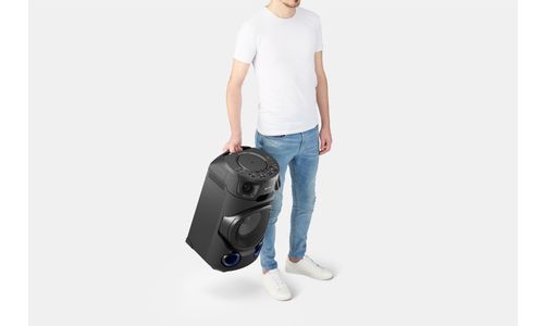 Donnez plus de punch à vos fêtes grâce à ce puissant système audio monobloc. Vibrez au rythme de vos morceaux préférés avec les tweeters hautes performances et le JET BASS BOOSTER. Profitez d'un jeu de lumières multicolores sur l'enceinte et personnalisez la fête grâce à notre application Fiestable, sa playlist de fête et le classement du karaoké. Les poignées rendent le transport encore plus facile