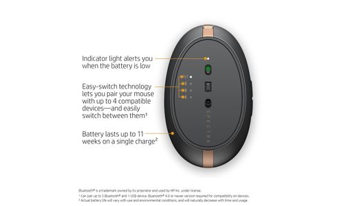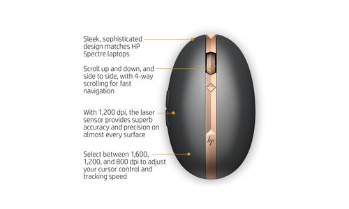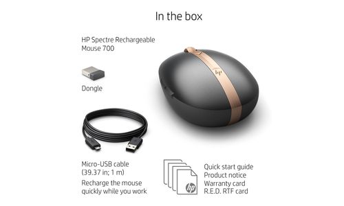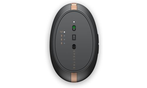 HP Souris rechargeable Spectre 700 (Cuivre Luxe). Format: Ambidextre. Technologie de détecteur de mouvement: Laser, Interface de l'appareil: RF Sans fil + Bluetooth, Résolution en mouvement: 1600 DPI, Type de boutons: Boutons poussoirs, Quantité de boutons programmables: 5, Type Scroll: Roue. Couleur du produit: Noir, Cuivre