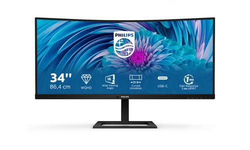 Philips E Line 346E2CUAE/00. Taille de l'écran: 86,4 cm (34"), Résolution de l'écran: 3440 x 1440 pixels, Type HD: Wide Quad HD+, Technologie d'affichage: LCD, Surface d'affichage: Mat, Temps de réponse: 4 ms, Format d'image: 21:9, Angle de vision horizontal: 178°, Angle de vision vertical: 178°. Haut-parleurs intégrés. Concentrateur USB intégré, Version du concentrateur USB: 3.2 Gen 1 (3.1 Gen 1). Montage VESA, Réglage de la hauteur. Couleur du produit: Noir