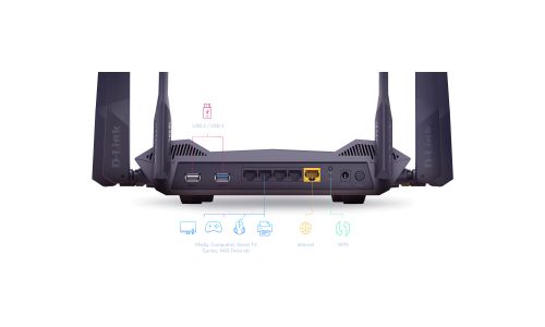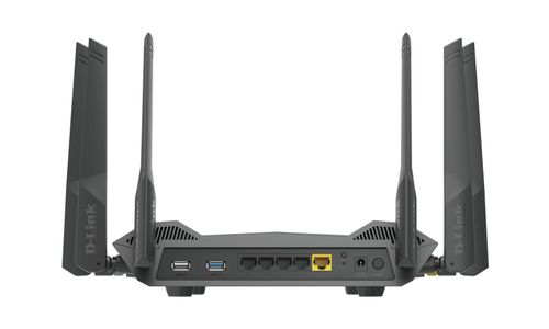 D-Link AX5400 Wifi 6 Router DIR?X5460. Standards réseau: IEEE 802.11a,IEEE 802.11ac,IEEE 802.11ax,IEEE 802.11b,IEEE 802.11g,IEEE 802.11n,IEEE 802.3ab,IEEE..., Type d'interface Ethernet: Gigabit Ethernet, Technologie de cablâge: 10/100/1000Base-T(X). Algorithme de sécurité soutenu: 128-bit AES,WPS. Mémoire flash: 128 Mo, Mémoire interne: 512 Mo, Prise en charge du système d'exploitation Windows: Windows 10,Windows 7,Windows 8,Windows 8.1,Windows Vista. Couleur du produit: Noir, Voyants: Réseau, Énergie, USB. Tension d'entrée AC: 100 - 240 V, Fréquence d'entrée AC: 50/60 Hz, Tension de sortie: 12 V