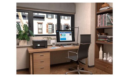 Imprimante à jet d'encre multifonction compacte pour les petits bureaux et les bureaux à domicile avec ADF, grand écran LCD, Wi-Fi et impression mobile.