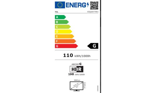 TCL QLED770 Series 65QLED770. Beeldschermdiagonaal: 165,1 cm (65"), Resolutie: 3840 x 2160 Pixels, HD type: 4K Ultra HD, Display technologie: QLED, LED backlight-type: Direct-LED. Smart TV. Motion interpolation technologie: PPI (Picture Performance Index) 3100, Helderheid: 260 cd/m², Responstijd: 15 ms. Formaat digitaal signaal: DVB-C, DVB-S2, DVB-T2. Ethernet LAN. Kleur van het product: Zwart