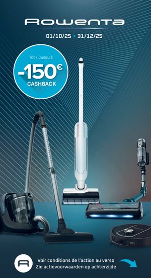 Rowenta Home Cleaning/ Linen Care: Jusqu'à 150€ remboursés Comment participer à cette action ? Achetez votre produit dans un point de vente participant à l’action entre le 01/10/2025 01/10/2025 et le 31/12/2025.