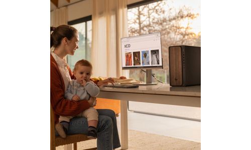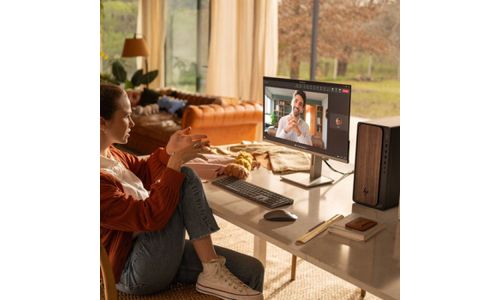Un ordinateur de bureau IA avec une finition moderne inspirée du bois qui s'intègre parfaitement à tous les espaces.
