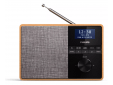 Een lichte, houten behuizing omsluit het zwarte, glanzende display en de luidspreker, die bedekt is met grijze luidsprekerstof. Aan de voorkant van de radio bevinden zich knoppen voor afstemming, bronselectie en meer. Met de slanke draaiknop verhoogt of verlaagt u het volume.