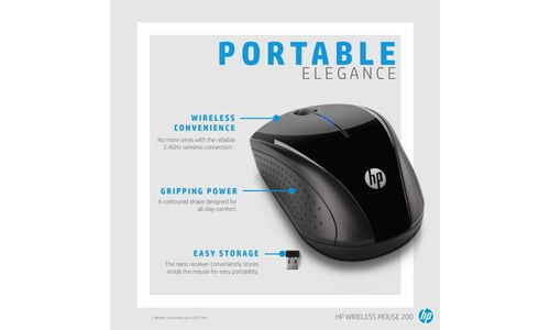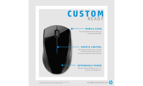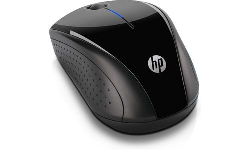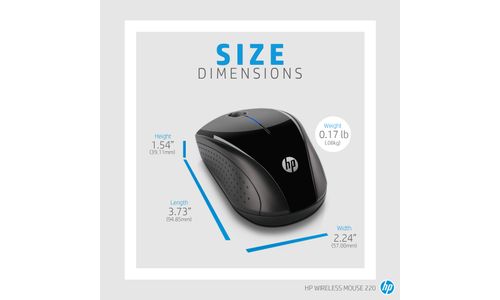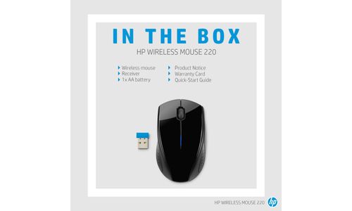 HP draadloze muis 220. Vormfactor: Ambidextrous. Aansluiting: RF Draadloos, Soort knoppen: Drukknoppen, Aantal knoppen: 2, Scroll type: Wiel. Stroombron: Batterijen. Kleur van het product: Zwart