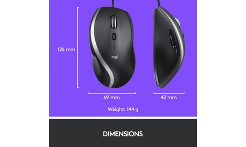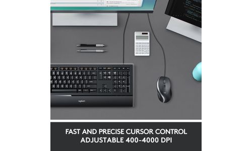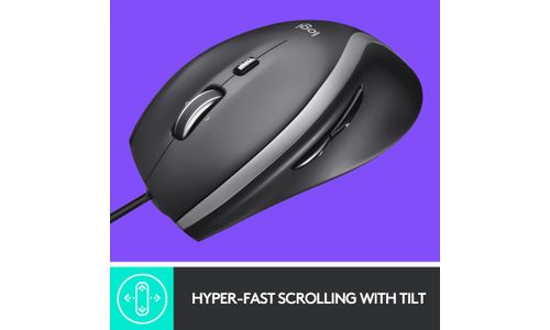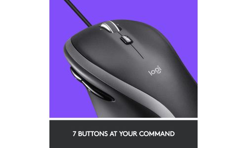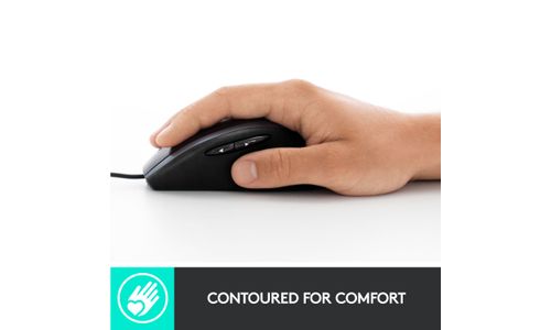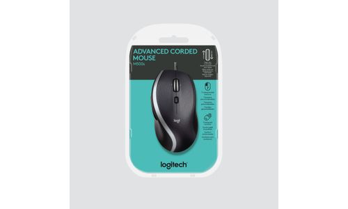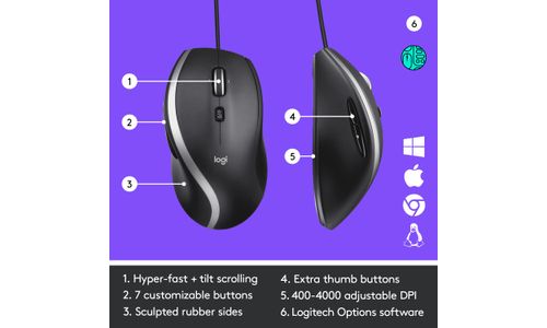 Logitech M500s Advanced Corded Mouse De Logitech® Advanced Corded Mouse M500s met supersnel scrollen voor hogere productiviteit. Met slechts één draai aan het soepele scrolwiel kun je door lange documenten en webpagina's vliegen. Of schakel over op de kliksgewijze modus voor nauwkeurige regelnavigatie van lijsten, dia's, afbeeldingen en menu's. Nu met aanpasbare dpi van 400-4000 voor snelle en uiterst nauwkeurige cursorbesturing. Zachte zijkanten en een gerond ontwerp zorgen voor meer steun en controle. Dankzij de zeven aanpasbare knoppen kun je gemakkelijk door webpagina's en fotoalbums navigeren. Plug-and-play-USB werkt direct uit de doos.