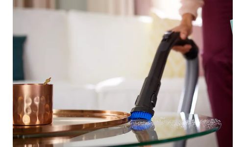 De stofborstel is in het handvat ingebouwd, zodat het apparaat altijd klaar is voor gebruik op meubilair, platte oppervlakken en bekleding.