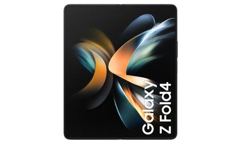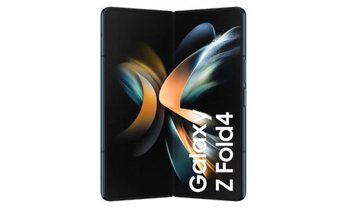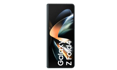 We zien de voorkant van de bovenkant van een dichtgeklapte Galaxy Z Fold4. Op de Cover Screen zien we een kleurrijke, lintachtige achtergrond. Daarachter zien we de achterkant van een tweede Galaxy Z Fold4.