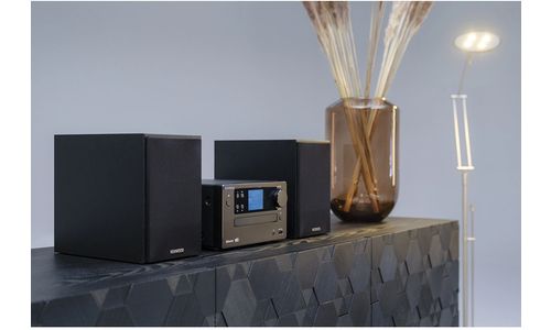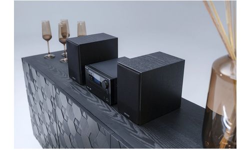 Micro HiFi-System with DAB+, CD, USB, Bluetooth Audio-Streaming and TFT colour display | 2,4“ (6,1 cm) TFT colour display | DAB+ / FM-RDS receiver | Amplifier with 2 x 25 W Output power | Bluetooth Audio-Streaming V5.1 (A2DP) | CD-Drive and USB-Port | Aluminum front panel and buttons | EQ-Presets: FLAT/CLASSIC/JAZZ/ROCK/POP | AUX-Input for connection of analogue sources | IR remote control | Programmable CD Playback incl. Shuffle/Repeat | USB-Playback incl. Shuffle/Repeat | SPEAKER: 2-Way Bass reflex speaker | DIMENSIONS: Main Unit: (W x H x D) 200 x 119 x 242 mm | Speaker: (W x H x D) 133 x 200 x 220 mm | BLACK