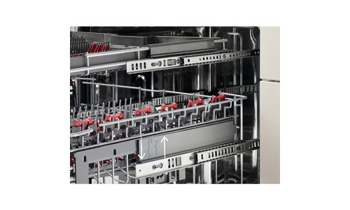 Zelfs als de bovenkorf geladen is, kan je het niveau van de bovenkorf van jouw vaatwasser eenvoudig aanpassen aan de vaat in de bovenste of onderste korf.