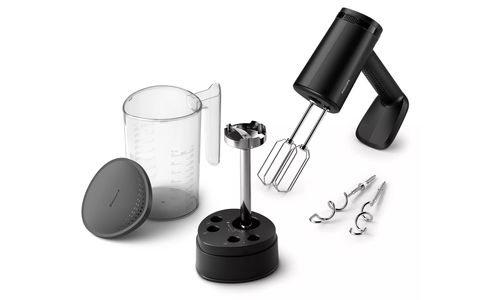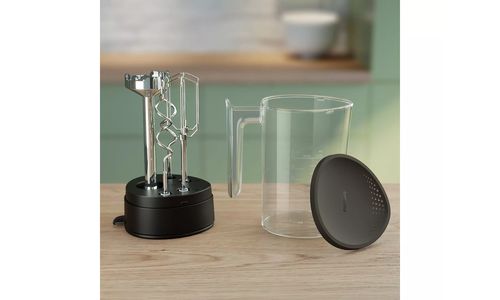 Deze 2-in-1-handmixer mixt of kneedt zelfs hardd deeg in enkele minuten. Bereik elke hoek van diepere kommen, minimaliseer de spatten en de reinigingstijd met het ontwerp voor lang bereik en de Soft Start-functie. Met blenderhulpstuk en bewaarbeker.