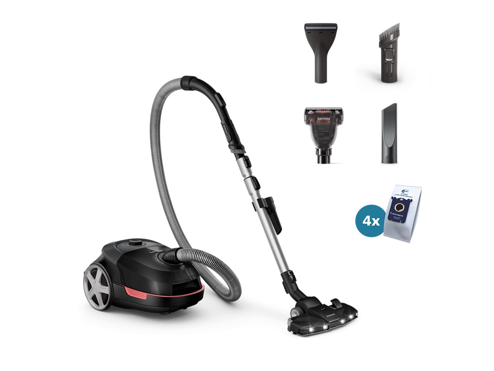 De grote stofbak van 4 liter en de duurzame universele zakken zorgen voor een optimale zuigkracht totdat de zak vol is. Het stof zit in een afgesloten ruimte, dus u kunt het zonder knoeien afvoeren.