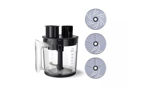 Ons keukenmachine-accessoire met hoge capaciteit van 1,7 liter is ideaal voor het hele gezin. Inclusief een S-mes voor het hakken van grote hoeveelheden voedsel en drie extra schijven waarmee u plakjes kunt snijden (dik of dun), evenals shredden (dik of dun) of raspen (voor aardappelpuree of kaas).