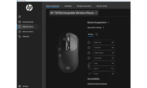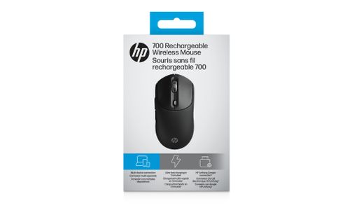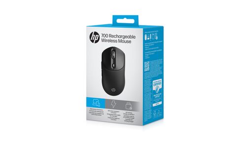 HP 700 oplaadbare draadloze muis. Vormfactor: Ambidextrous. Aansluiting: RF-draadloos + Bluetooth, Bewegingsresolutie: 6000 DPI, Soort knoppen: Drukknoppen, Aantal knoppen: 8, Scroll type: Wiel. Stroombron: Batterijen. Werkt op elk oppervlak. Kleur van het product: Zwart